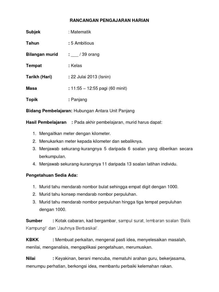 Rph Matematik Tahun 5 Kbsr Hubungan Unit Panjang Pdf
